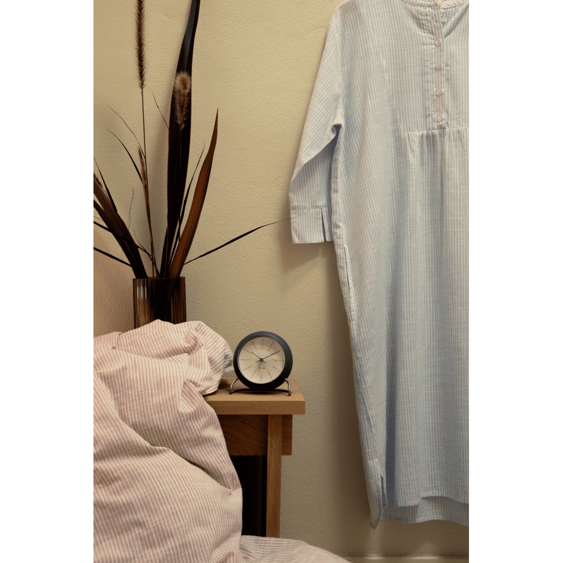 Die elegante Bankers-Uhr wurde 1971 speziell für die Dänische Nationalbank entworfen. Nach der Fertigstellung des Gebäudes 1978 wurde die Bankers-Uhr im 20 Meter hohen Foyer platziert. Diese einzigartige Tischuhr verkörpert dänisches Design auf neutrale und dennoch detailreiche Weise. Sie ist das perfekte dekorative und minimalistische Designstück für Ihr Interieur. Zu den Funktionen der Tischuhr gehören ein Wecker, eine Schlummerfunktion und ein Lichtsensor. Der dritte Zeiger der Uhr dient zum Einstellen des Weckers.