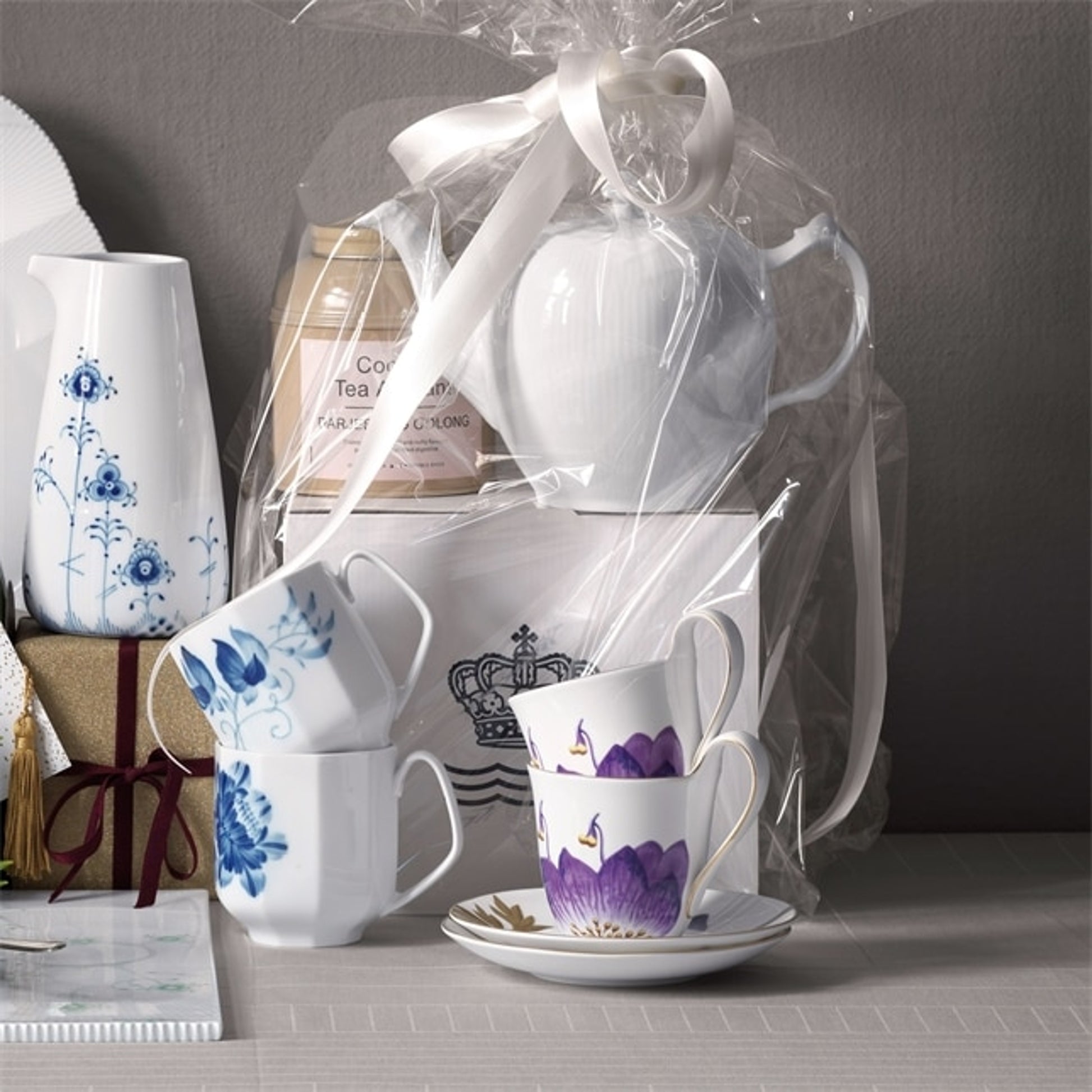 Adorned by a gracious pansy, this 27 cl / 9.1 Oz Flora High Handle Cup and Saucer appears with a deep purple hue and enlarged stamens seemingly swaying in a gentle breeze. The gold details of the pieces are complimented by the leaves of the stem, which are kept in an umber colour scale. Flowers have long been a means of communication across time and cultures.