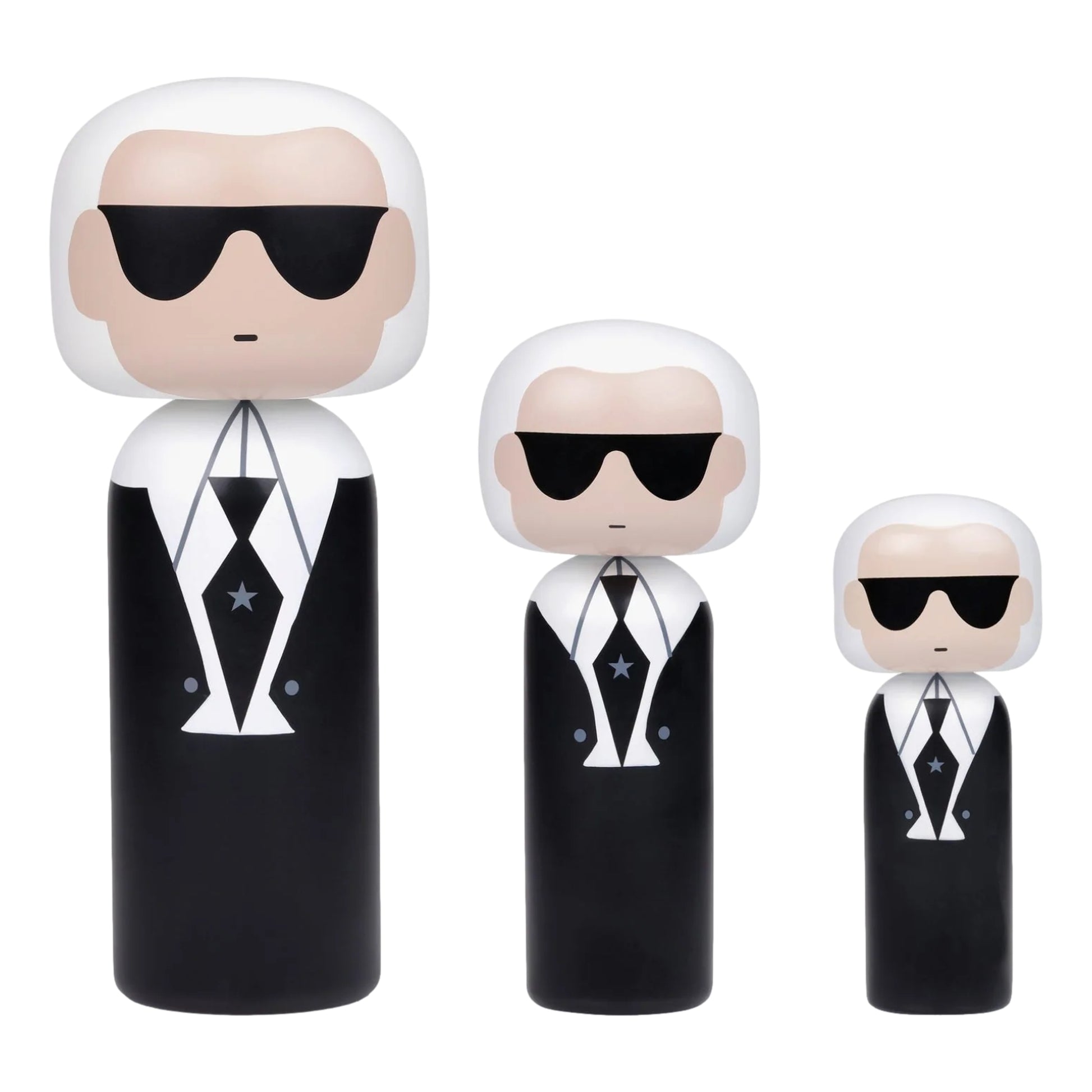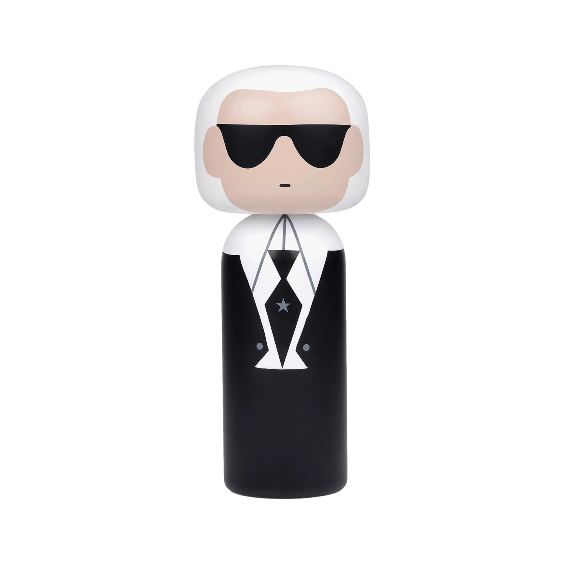 This kokeshi inspired by Karl is a stylish and sophisticated wooden doll that pays homage to the iconic fashion designer and creative director.It features a sleek and chic design with his signature high-collared shirt, black tie, and sunglasses, all inspired by his unmistakable fashion sense. The kokeshi is a playful representation of Karl’s iconic style and creativity, capturing the essence of his innovative and visionary approach to fashion.