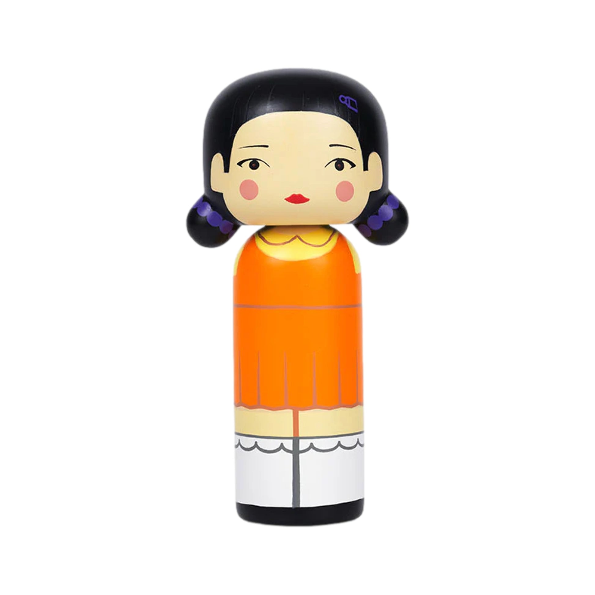Experience the eerie charm of Squid Game with this handcrafted Lucie Kaas Kokeshi doll inspired by the iconic Young-hee doll. Capturing her unforgettable look from ""Red Light, Green Light,"" this figure features her distinctive schoolgirl outfit, signature pigtails and that unmistakable, hauntingly blank expression.