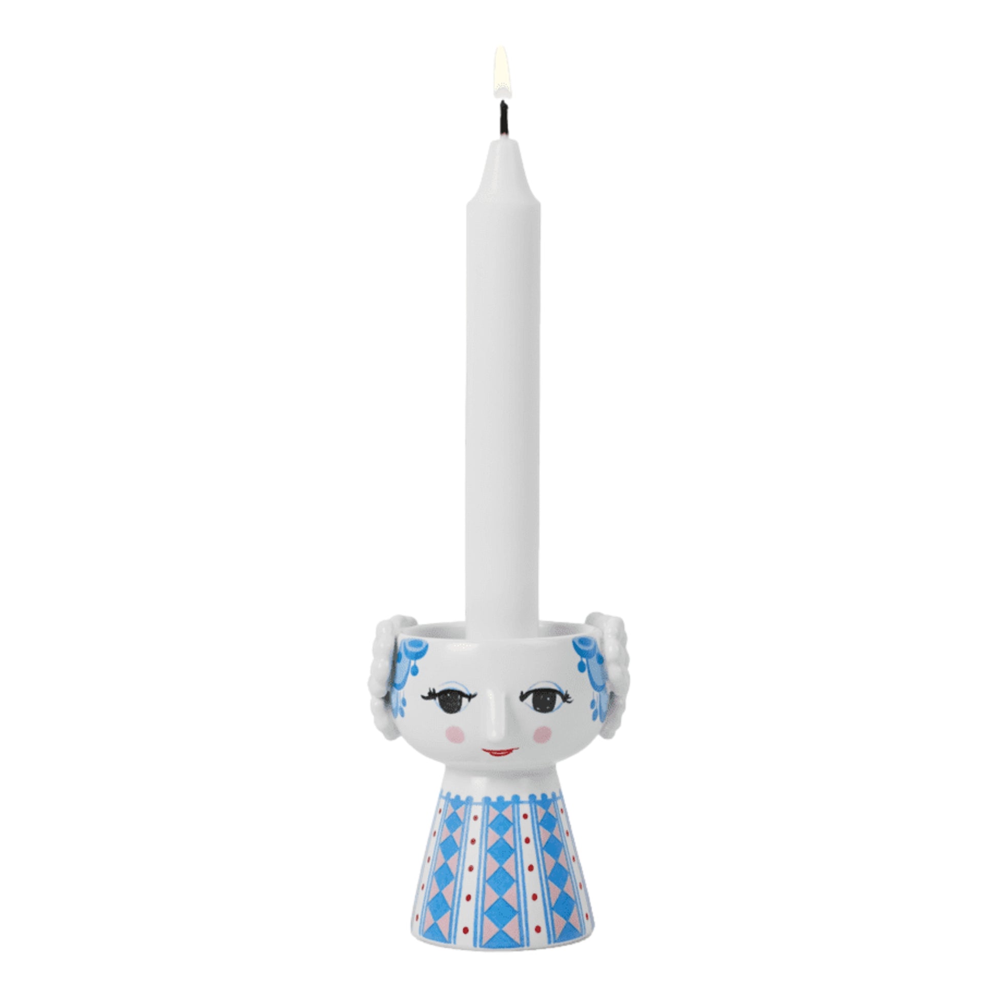 The candlestick is decorated with blue hair and a colorful dress with a beautiful diamond pattern in blue and pink shades complemented by rows of red dots. The Eva candlestick exudes a love of opulence and is perfect for both tealights and candles – or all by itself as a small sculptural feature in the interior. An Eva candlestick decorates and creates joy both on the table and on the shelf, where it lights up and makes everyday life a little more colorful - just as Bjørn Wiinblad loved it.