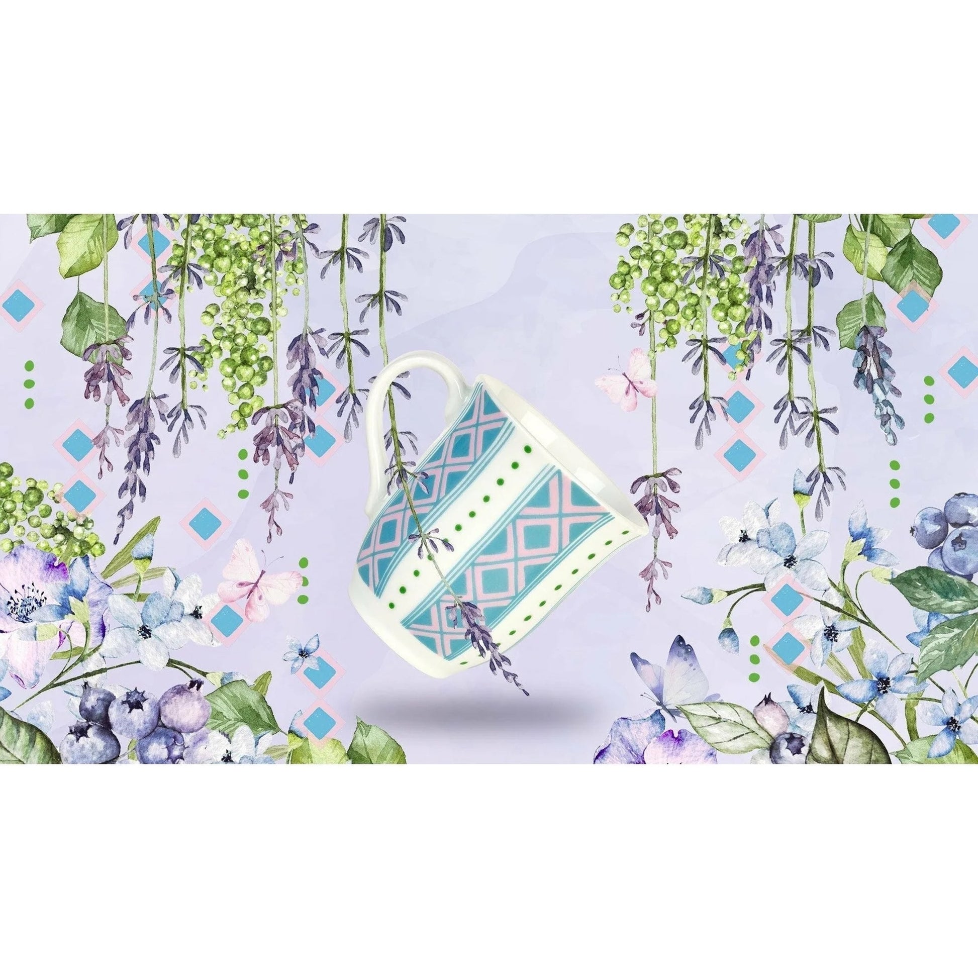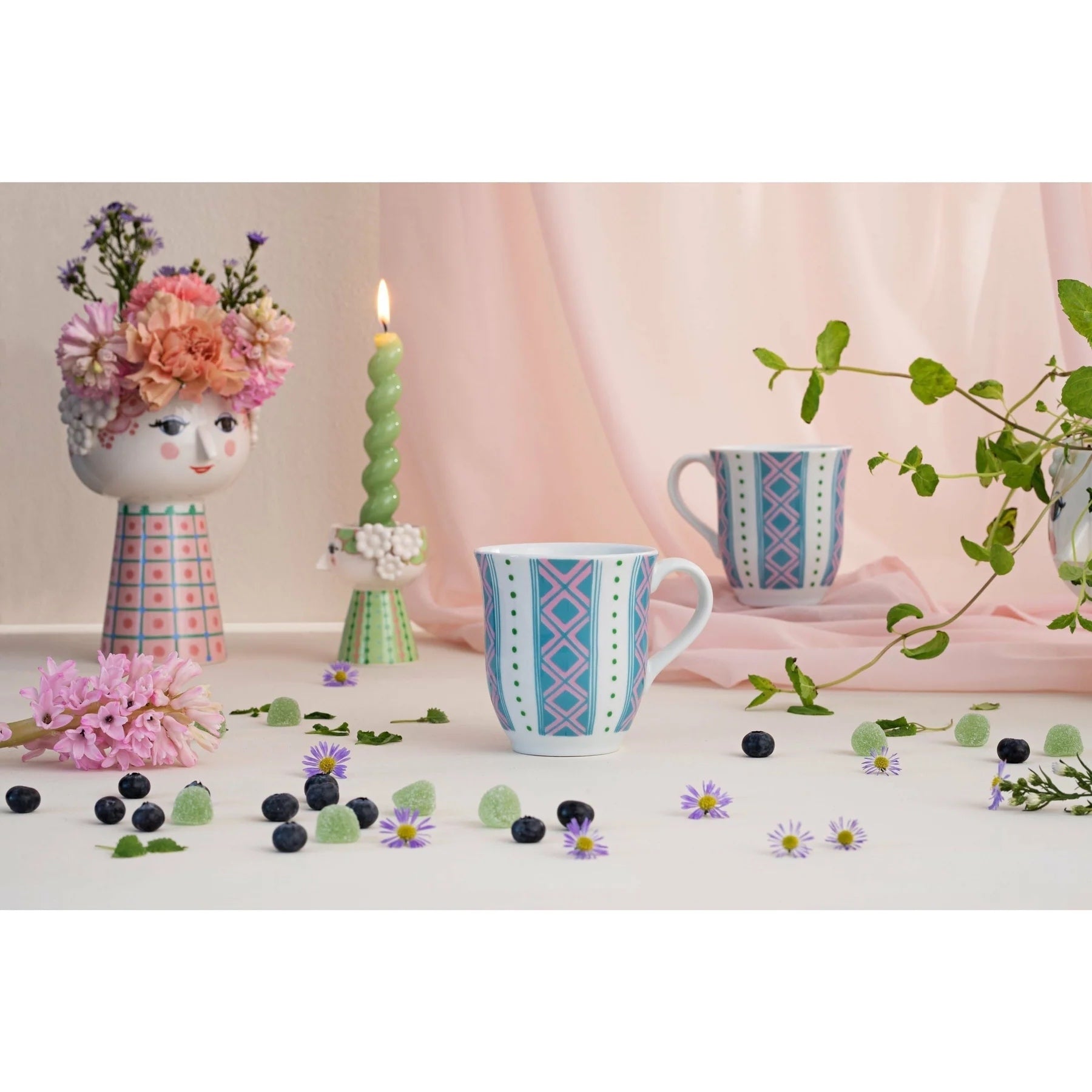 Eva mug in light blue has a nice diamond pattern in light blue and pink with green dots. The pattern is inspired by the “dresses” of the EVA vases, and the colors are kept in the same delicate shades that characterize EVA's happy and friendly universe. The mug is perfect for a good cup of coffee or tea. It can be safely washed in the dishwasher, so you can have fun with other things in life than doing the dishes. Each mug has its own look and color palette expressed within the characteristic design language of Bjørn Wiinblad. Eva mug will add color and joy to your home, the coffee table, and everyday living – in line with the spirit of Bjørn Wiinblad
