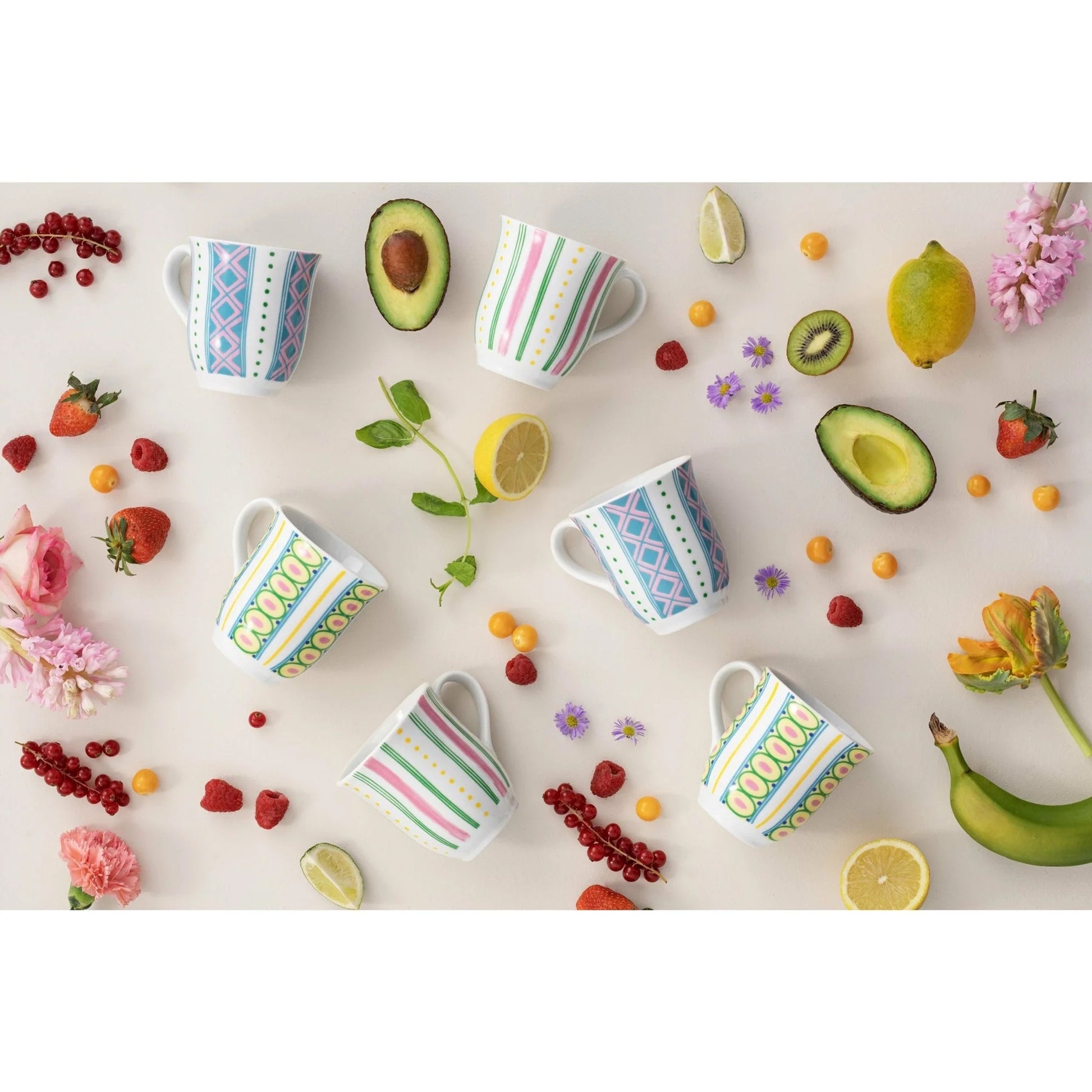 If you could travel back in time and have a cup of tea or coffee with Bjørn Wiinblad, you would be guaranteed an abundance of stories from around the world. Everything but minimalistic, the universe of Bjørn Wiinblad is lavish, quirky, extraordinary, rich of colors full of life and defined by a unique style. The whimsical and artistic decorations are now expressed on the Eva mugs, where colorful, geometric shapes with a hand-drawn touch are mixed together.