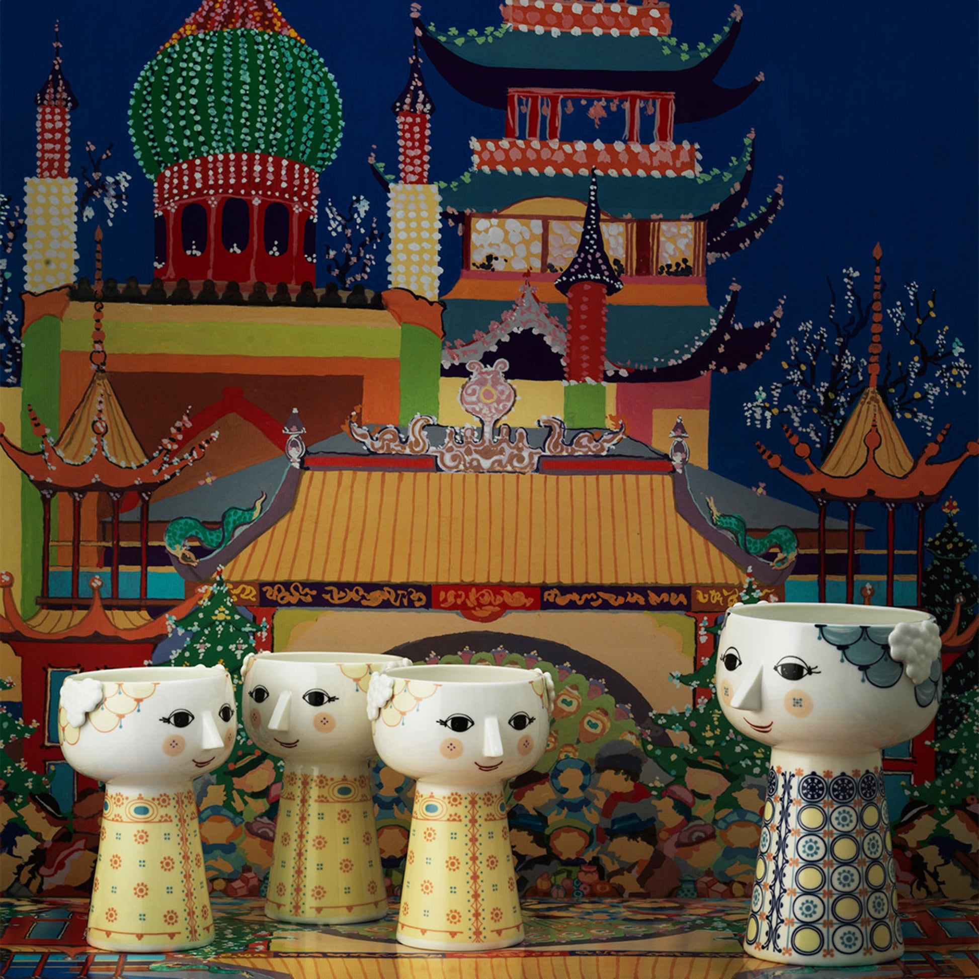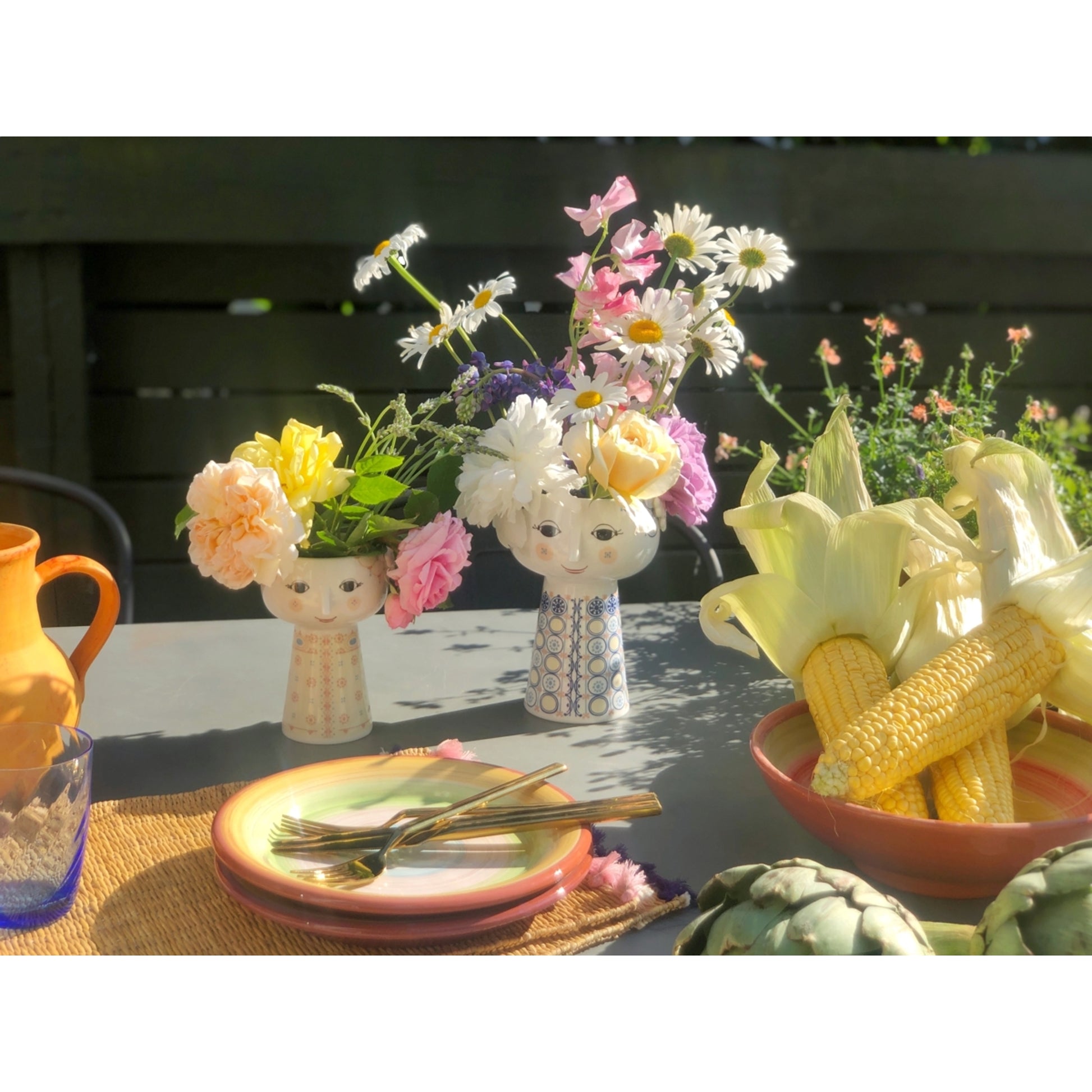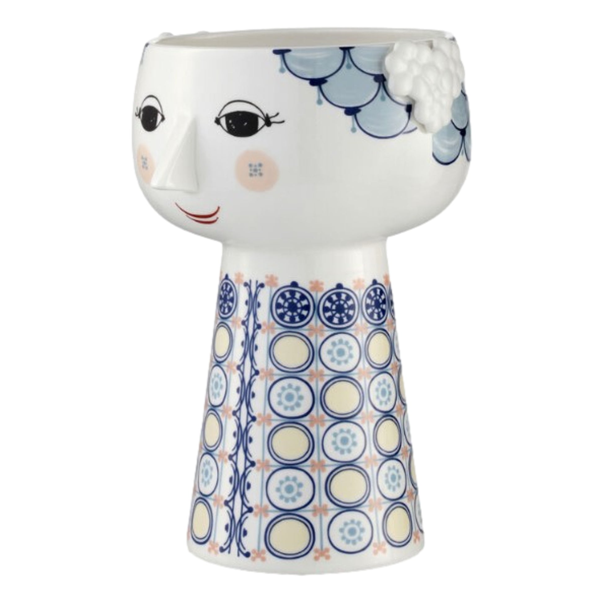 Beautiful and smiling Eva vase from Bjørn Wiinblad. The vase is perfect for beautiful flower bouquets. The vase is made of glossy glazed ceramic with colored decall and is inspired by Wiinblad's original Eva vases, which had wide heads with floral decorations and a cone-shaped body. The delicate face is from Wiinblad's original line and the dress pattern is taken from Wiinblad's illustrations.