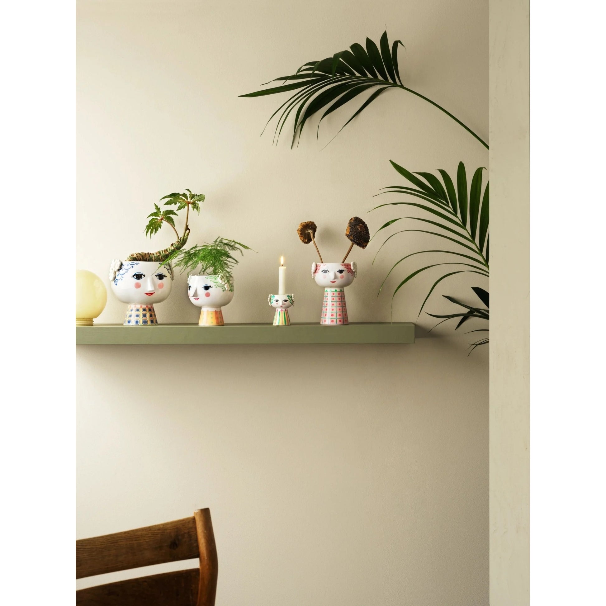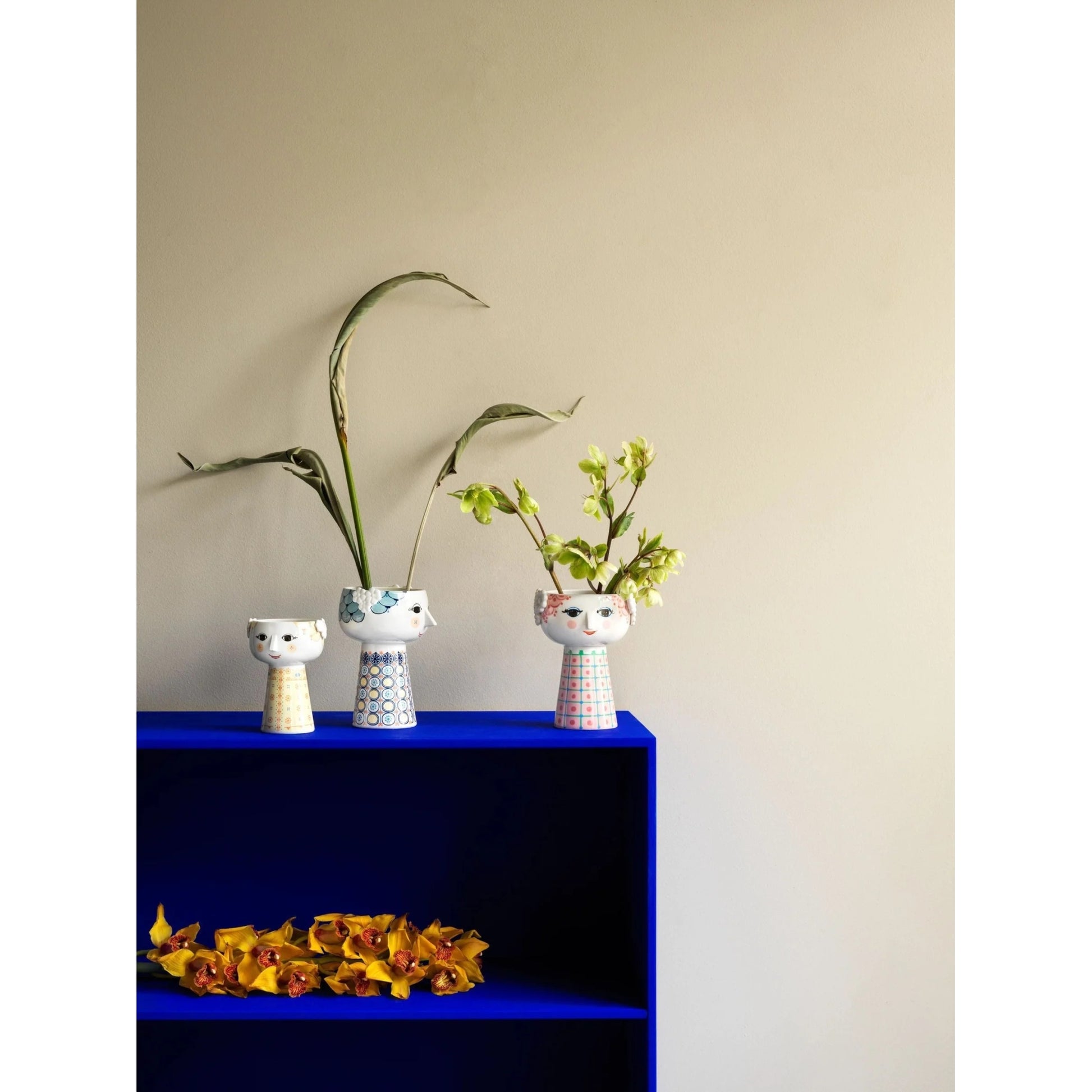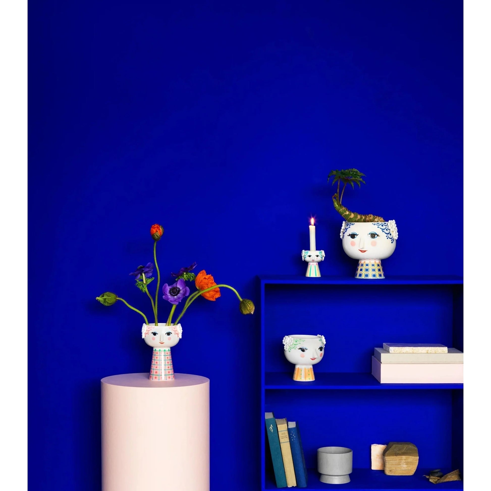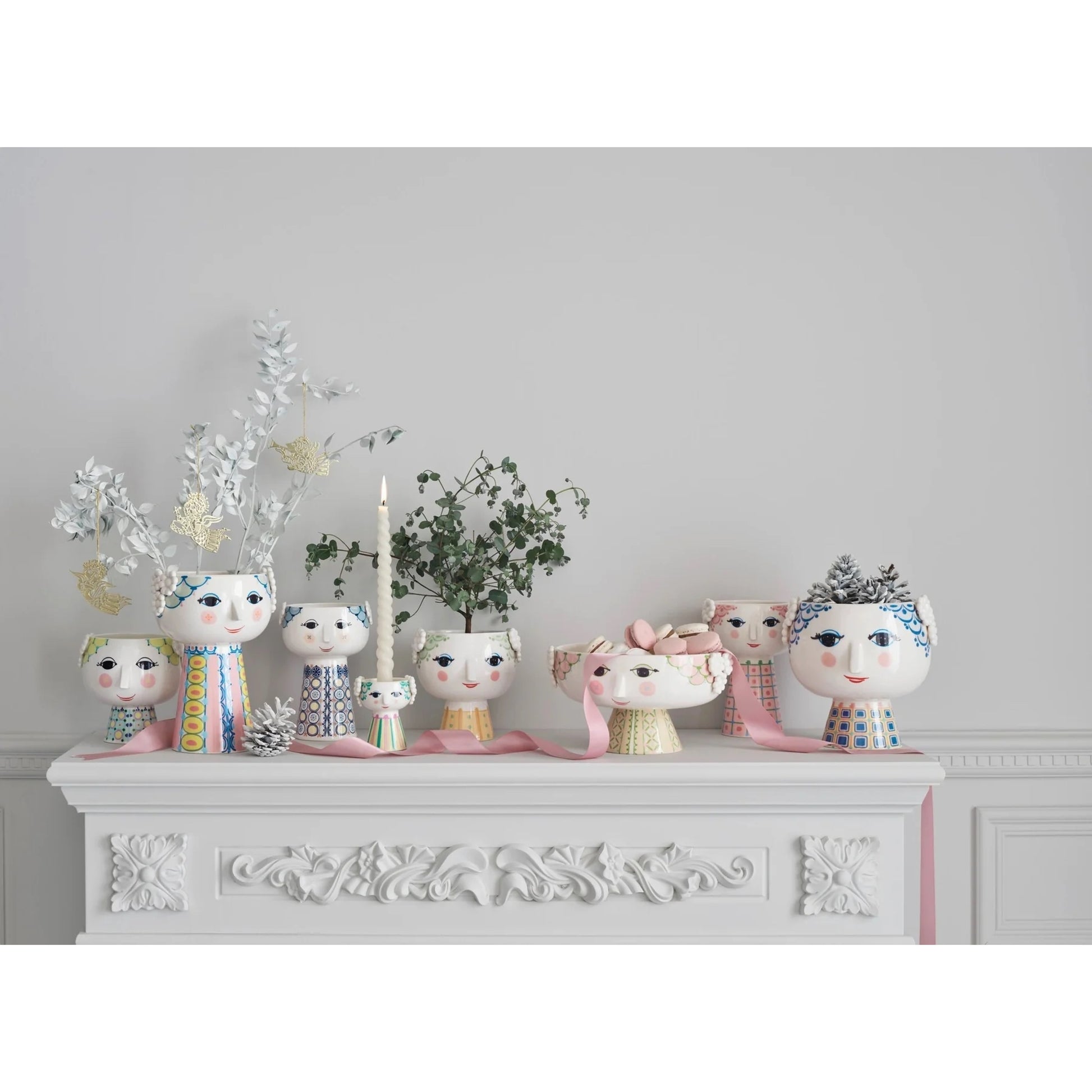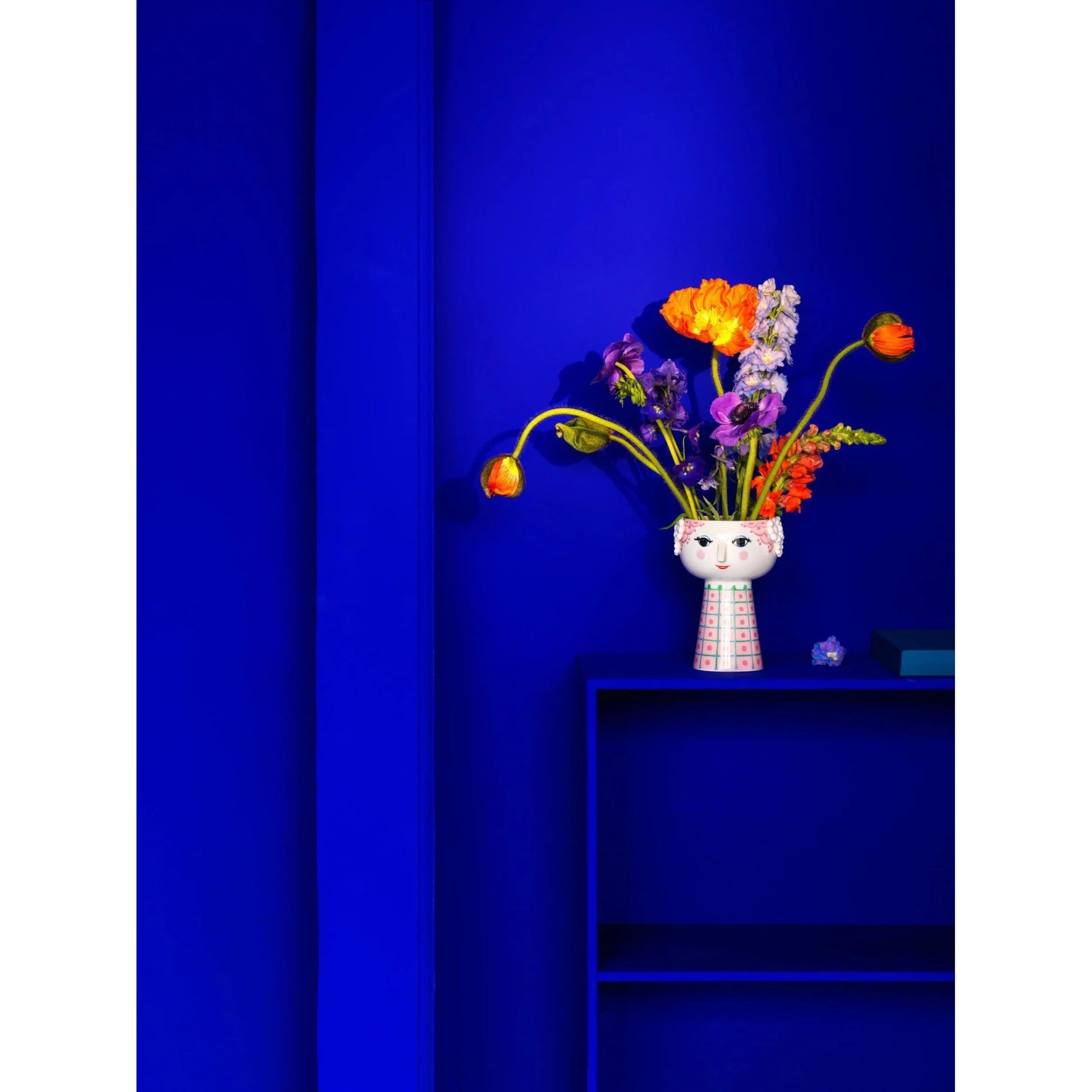 Beautiful and smiling Eva vase from Bjørn Wiinblad. The vase is perfect for beautiful flower bouquets. The vase is made of glossy glazed ceramic with colored decall and is inspired by Wiinblad's original Eva vases, which had wide heads with floral decorations and a cone-shaped body. The delicate face is from Wiinblad's original line and the dress pattern is taken from Wiinblad's illustrations.
