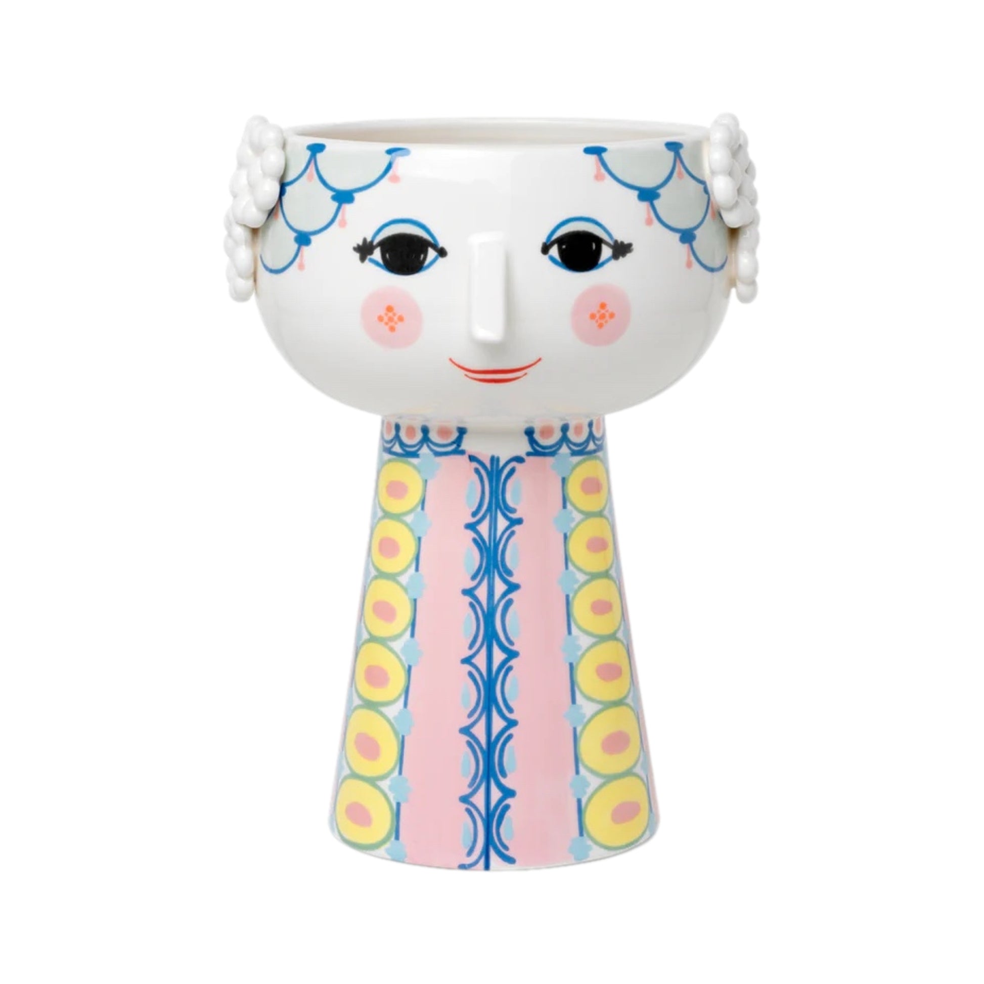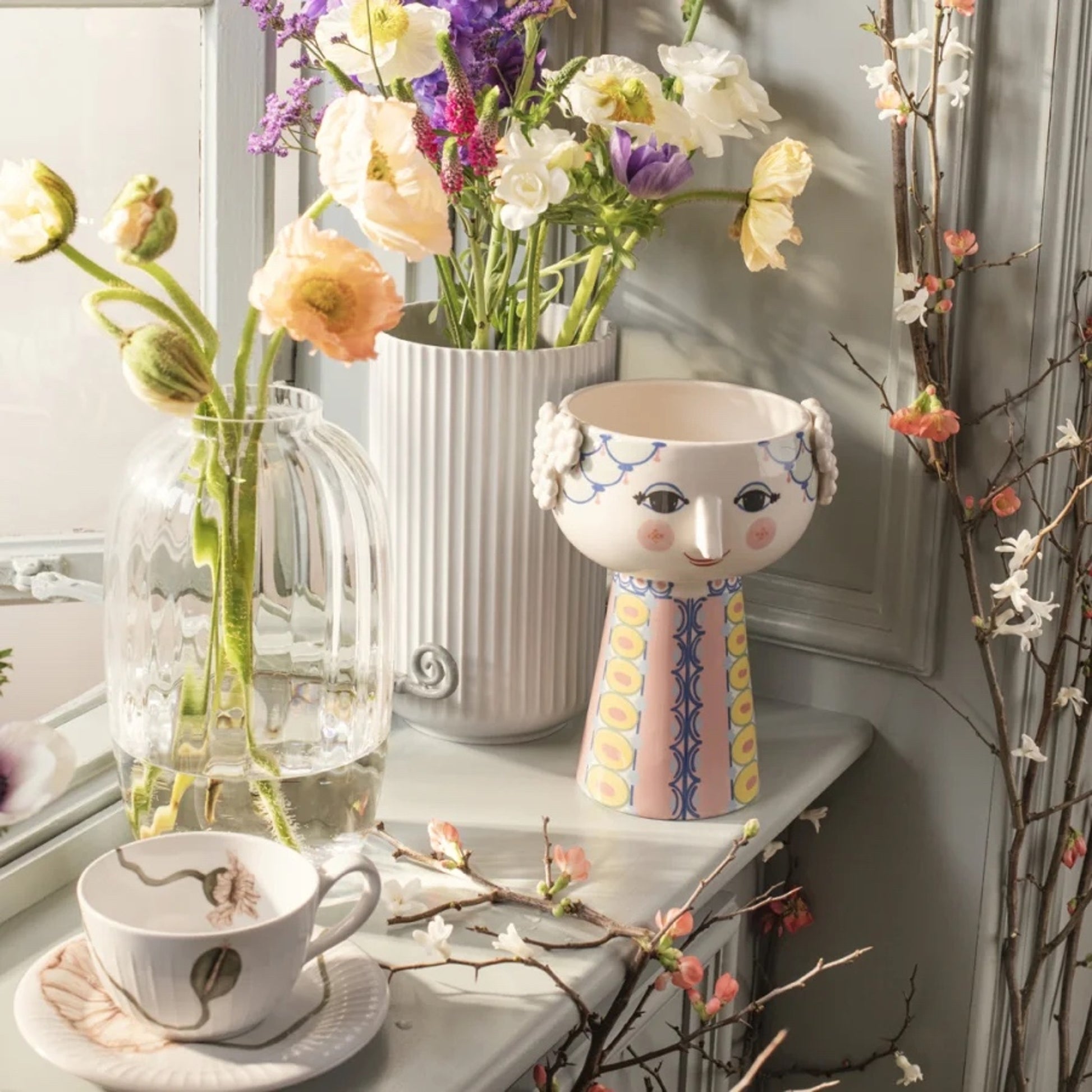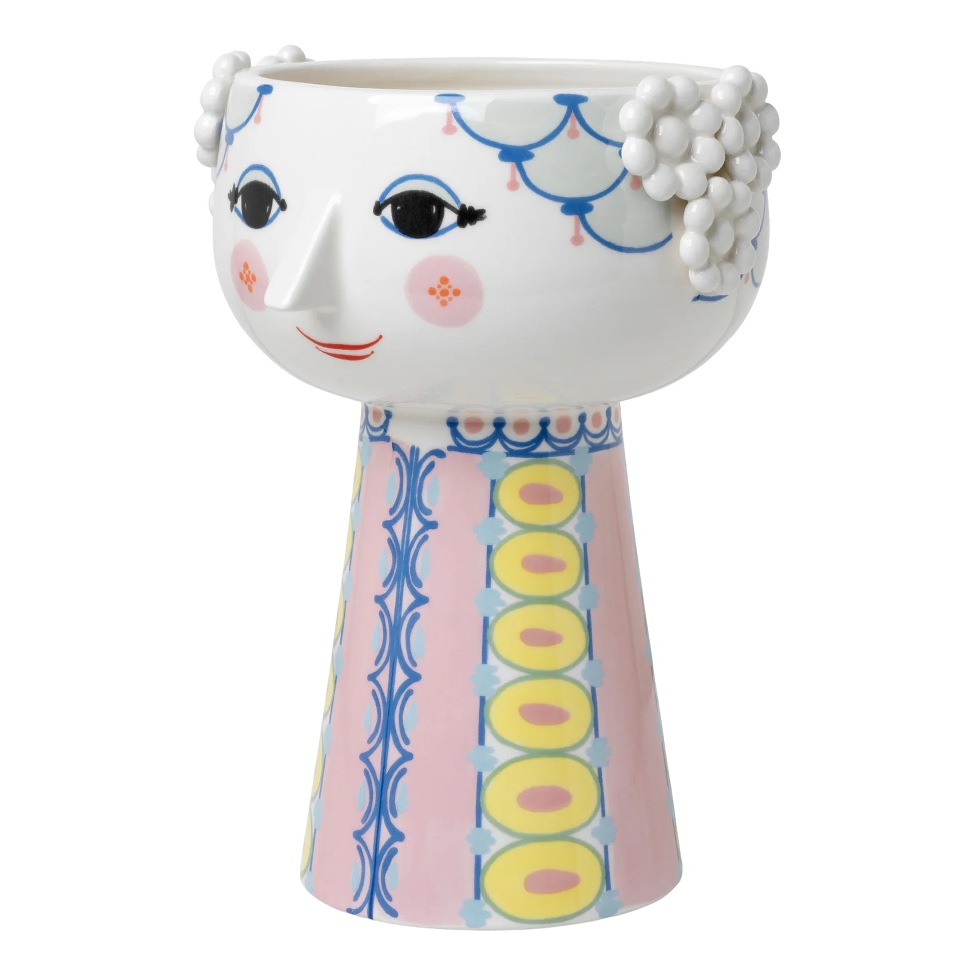 Beautiful and smiling Eva vase from Bjørn Wiinblad in a lovely pink shade. The vase is perfect for beautiful flower bouquets. The vase is made of glossy glazed ceramic with colored decall and is inspired by Wiinblad's original Eva vases, which had wide heads with floral decorations and a cone-shaped body. The delicate face is from Wiinblad's original line and the dress pattern is taken from Wiinblad's illustrations.