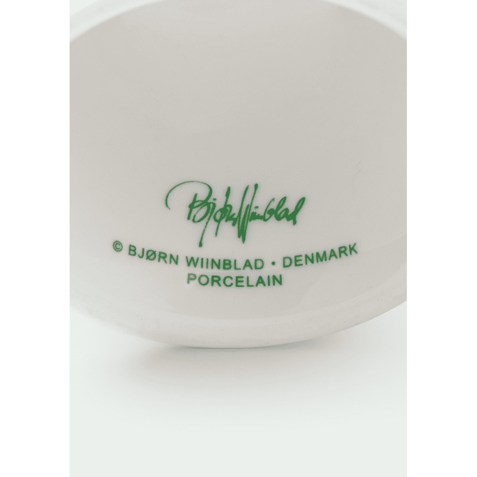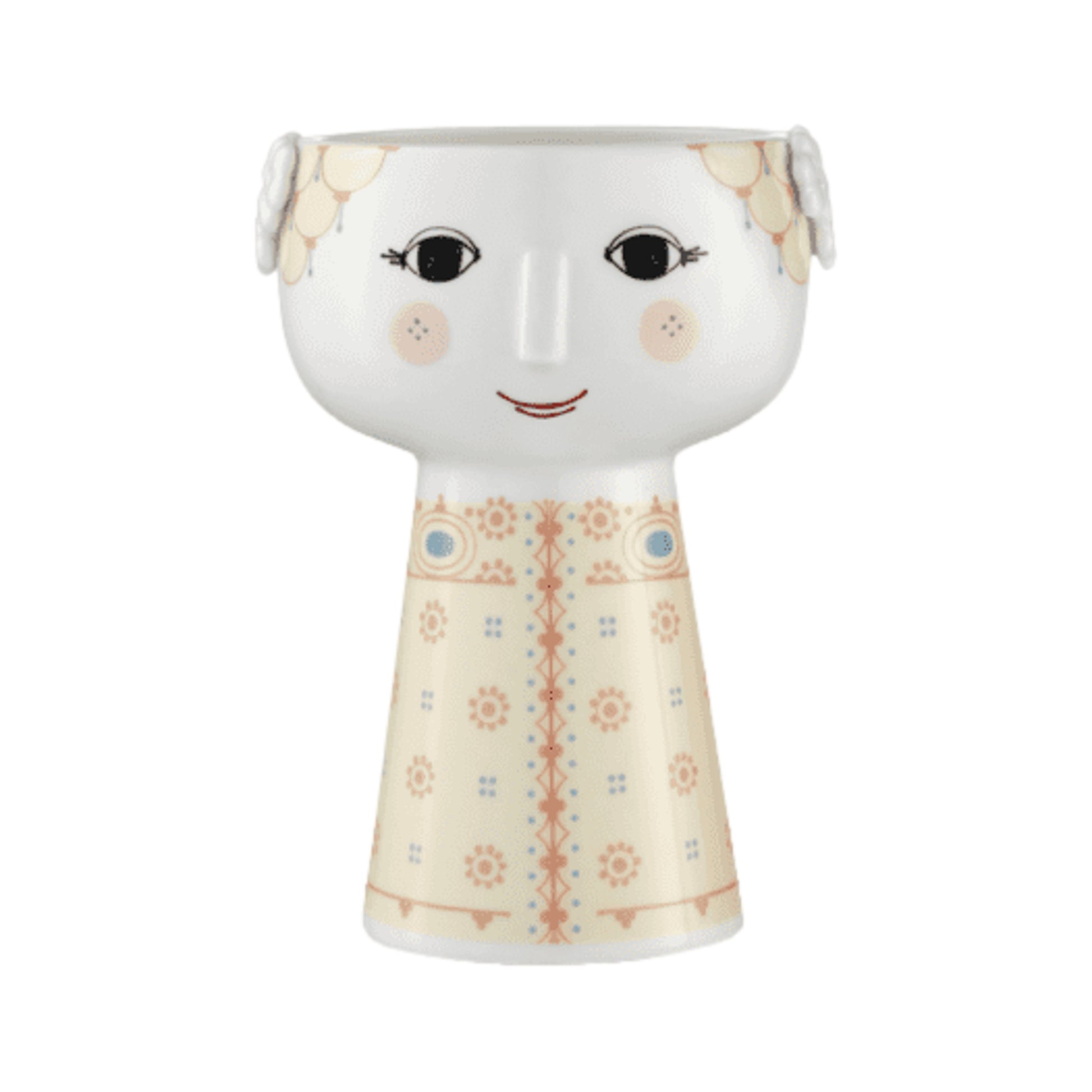 The vase is made of glossy glazed porcelain and is absolutely perfect for smaller flower bouquets or a fresh hyacinth. The face with the almond-shaped eyes and the pointed nose is Wiinblad's original line, while the colorful dress pattern is a reinterpretation of Bjørn Wiinblad's illustrations from the archives. The shape is inspired by Wiinblad's original and iconic Eva vases, which had wide heads and cone-shaped bodies.