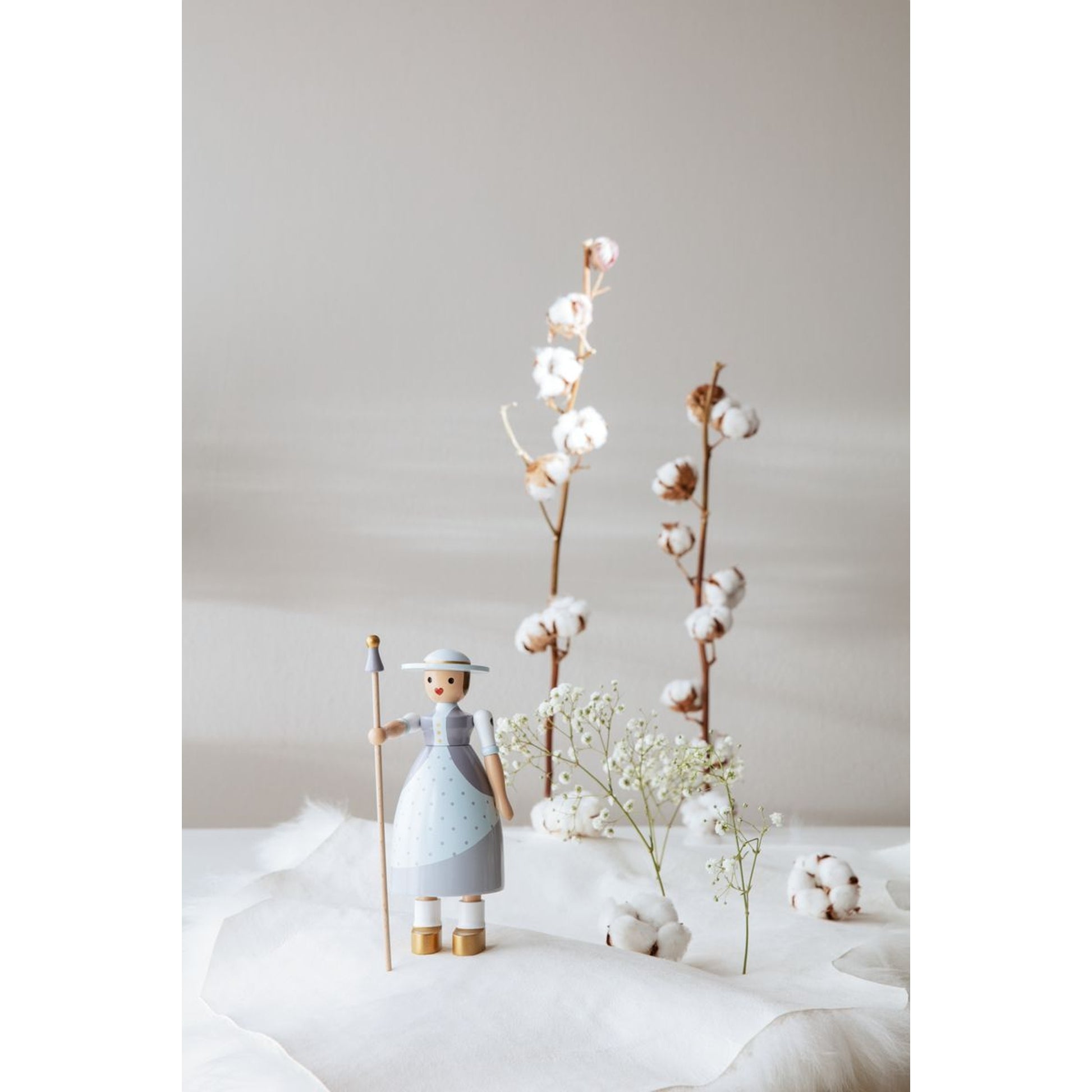 The shepherdess looks queite adventurous in Kay Bojesen's interpretation with gilded shoes, a hat with gold details, and a shepherd's staff - exactly as she is described in H.C. Andersen's fairy tales. Her heart-shaped mouth emphasizes her sweetness and innocence. She is beautiful and graceful, and in the company of the Chimney Sweeper, they become as a couple a symbol of love and togetherness.