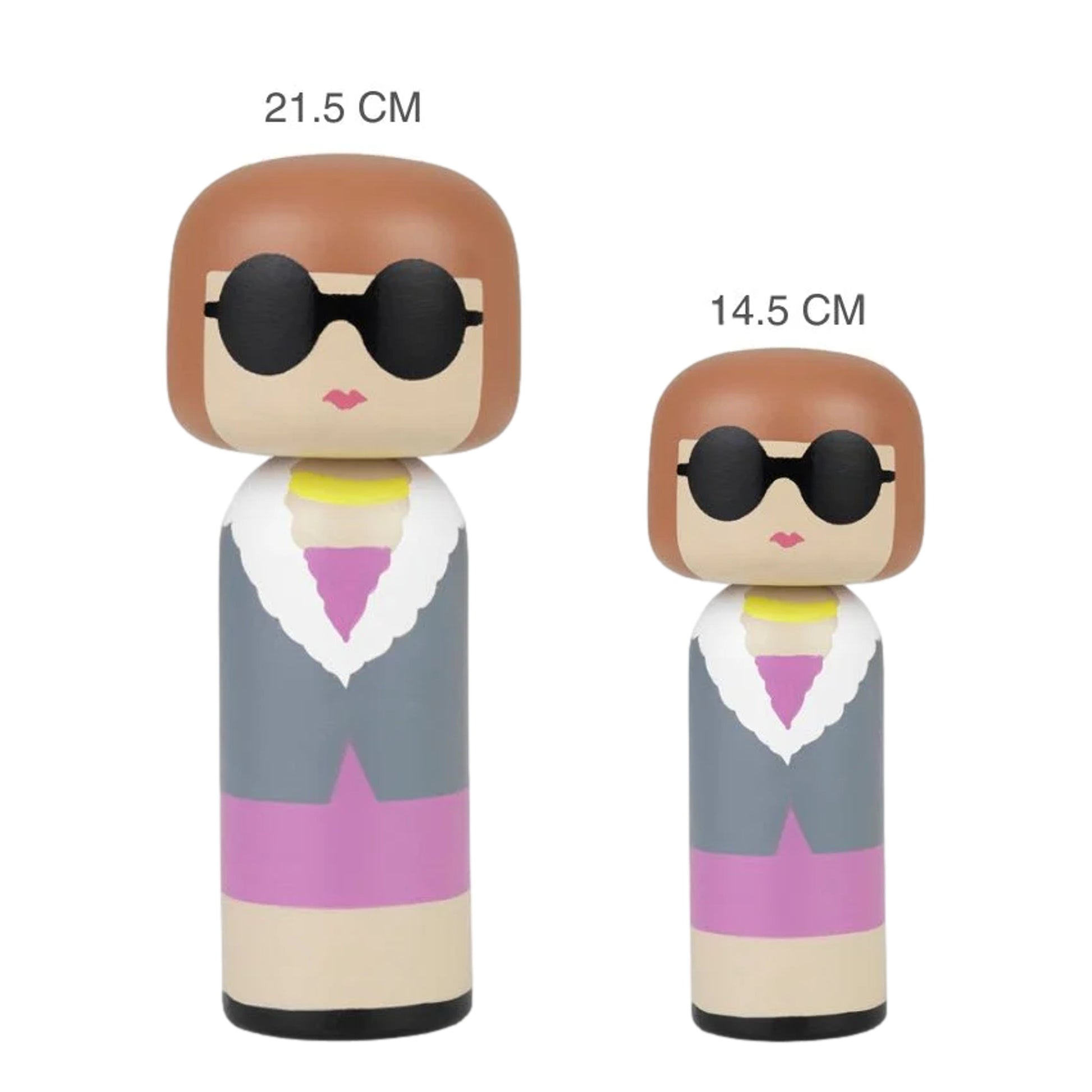 The Anna Kokeshi is a stunning and sophisticated wooden doll that pays homage to the iconic fashion editor-in-chief. Modern design with her signature bob haircut, black sunglasses, and a stylish suit jacket, all inspired by her impeccable fashion sense. The doll's design is a playful representation of Anna's iconic style and her influential role in the fashion industry.